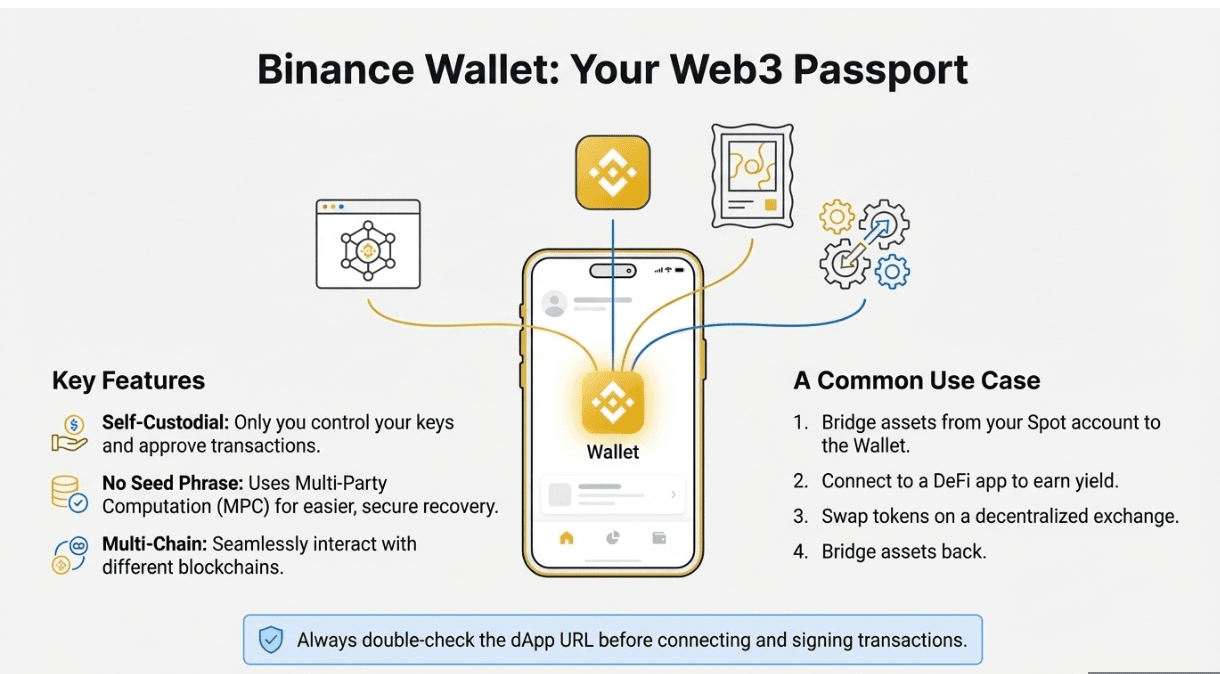 A Web3 wallet works like a set of house keys for blockchain addresses you control. Binance Wallet is multi-chain and self-custodial, meaning only you can approve transactions. It uses multi-party computation, so there is no 12-word seed phrase to lose.
