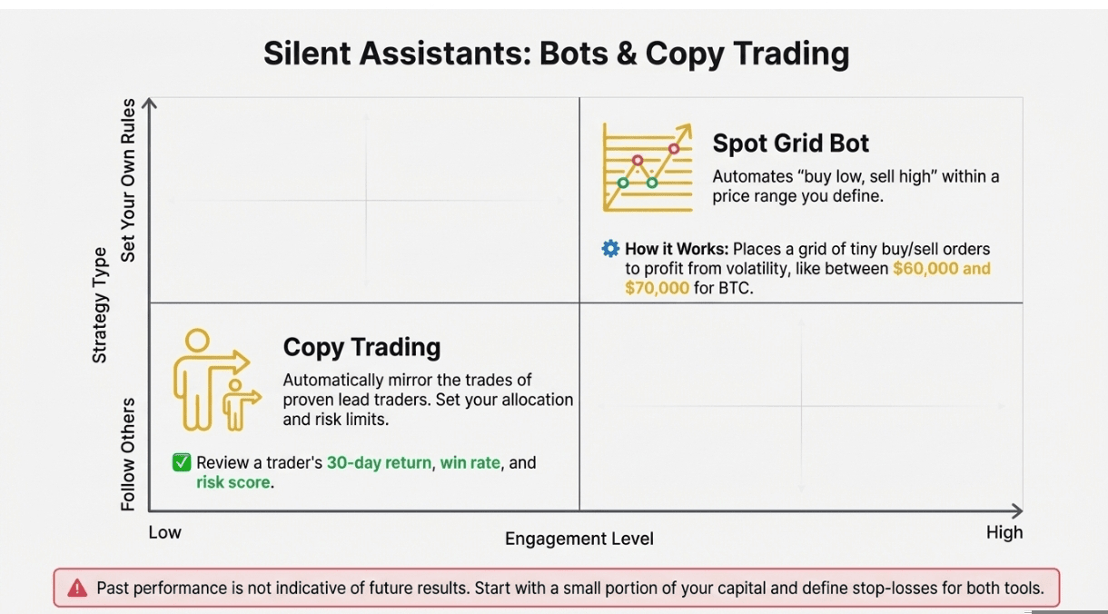 When comfortable, start a tiny Grid Bot or mirror a low-risk lead via Copy Trading.