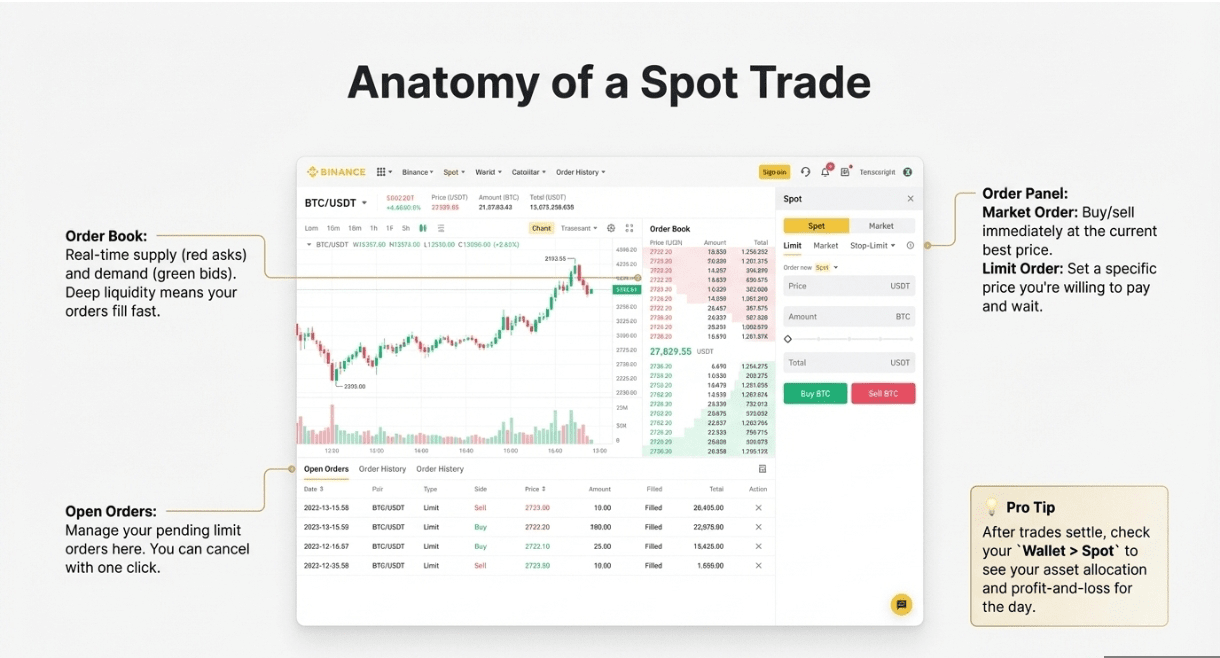Spot Trading feels like the full supermarket checkout where you can pick brands, compare prices, and use coupons. You decide whether to buy at the current price (Market) or set your own (Limit).