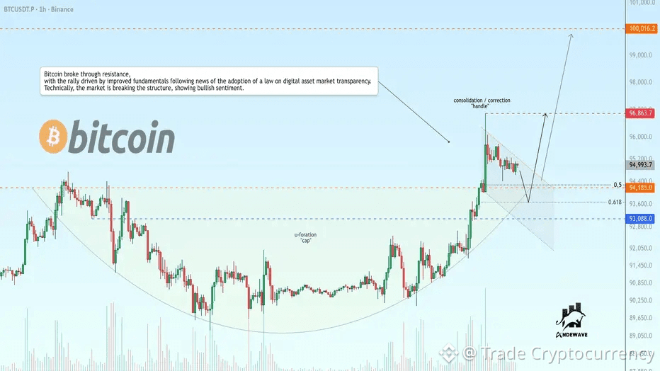 Bitcoin broke through resistance, with the rally driven by improved fundamentals following news of the adoption of a law on digital asset market transparency. Technically, the market is breaking the structure, showing bullish sentiment.