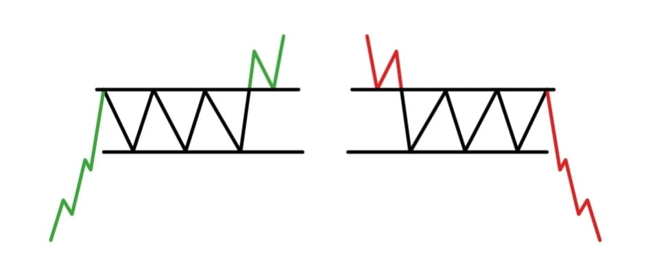 Prices fluctuate between two parallel lines, and eventually, a breakout occurs in one direction or the other. Rectangles can have a slight upward or downward tilt, but the two lines (support and resistance) are always parallel. In this respect, they seem similar to horizontal channels. These formations reflect the indecision of market players, so the most important here is the direction of the breakout when it occurs.