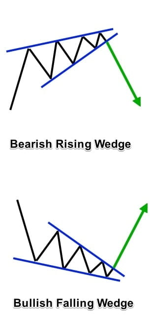 Ascending wedges are bearish signals that develop when the trading range narrows over time but has a clear upward slope. This means that, unlike ascending triangles, both subsequent lows and subsequent highs in the wedge pattern will rise as the trading range narrows to the top of the wedge.