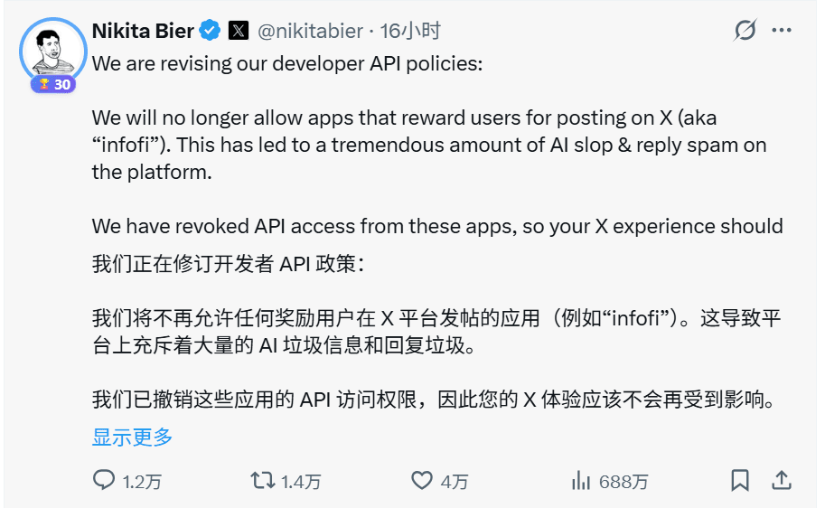 However, this model suffered a devastating blow from X officials on January 15, 2026. X product head Nikita Bier publicly announced that due to such applications flooding the platform with 'AI-generated junk information and replies (AI slop & reply spam)', X decided to revoke API access for related applications.