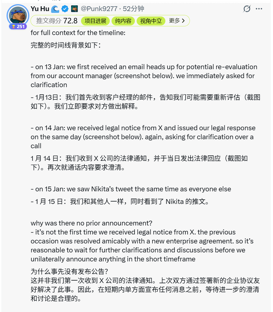 After the news was announced, founder Yu Hu also admitted to having communicated with X. This means that while you were tweeting all night to earn points, the team was already well aware and had completed high-level reductions in advance.