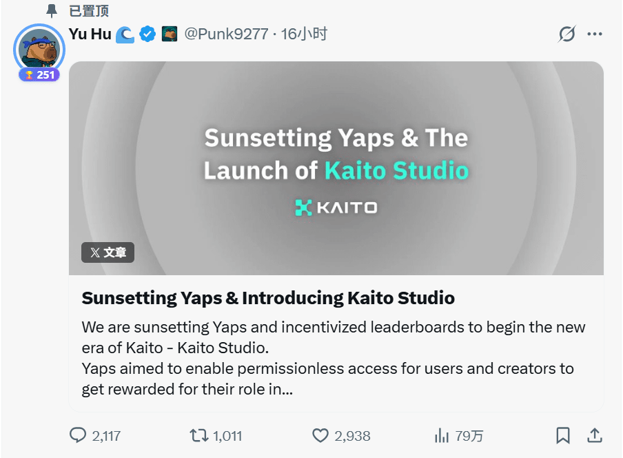• Business level: Kaito founder Yu Hu was forced to announce the termination of the Yaps business and transition to a traditional marketing platform, Kaito Studio.