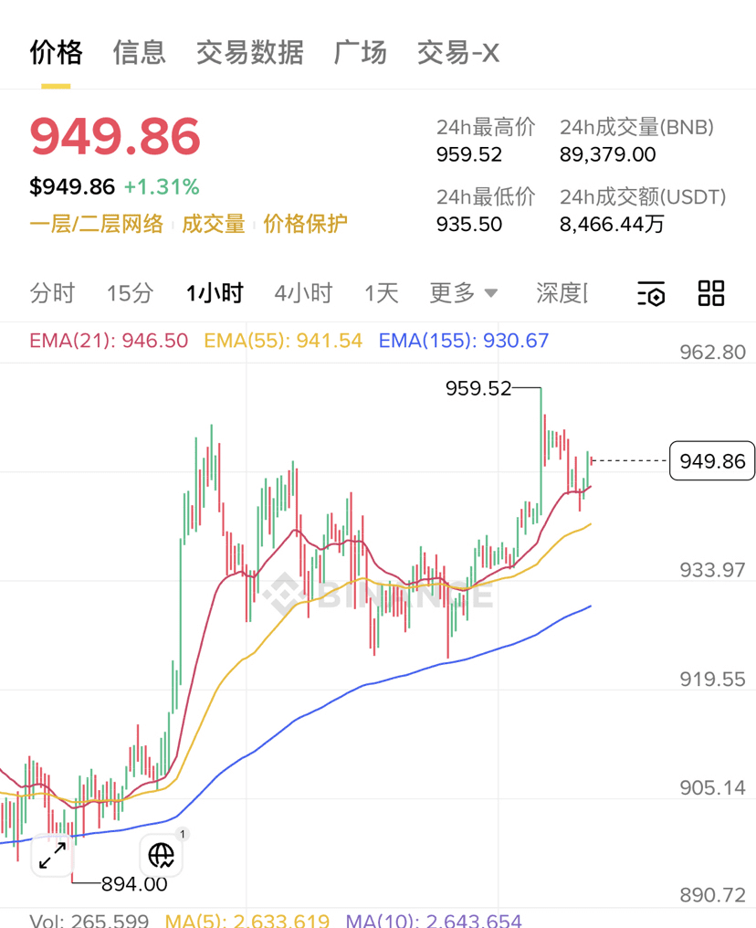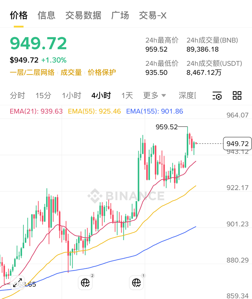 4-hour chart: EMA21 (939.63) has crossed above EMA55 (925.46) to form a golden cross, and EMA155 (901.86) continues to turn upward, forming a 'short, medium, and long-term moving average resonance bullish' pattern.