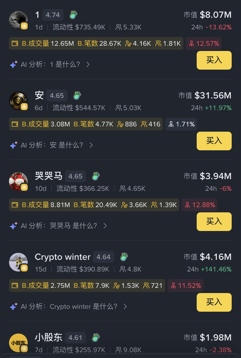 11. Stay Away from Ultra-New Projects: Meme coins that have been launched for less than three weeks should be watched rather than rushed into unless backed by top-tier institutions. A drop of 75%-94% indicates that bottom-fishing is likely to be buying at mid-slope.