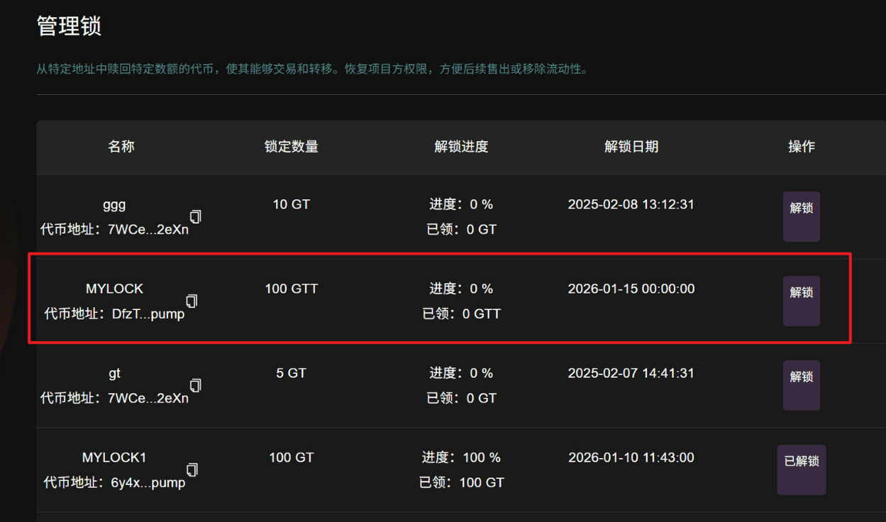 Once the lock is created, the tokens are transferred to a time-controlled contract address, and can only be withdrawn after reaching the unlock time (some tools support one-time unlocking, while others support linear/segmented releases).