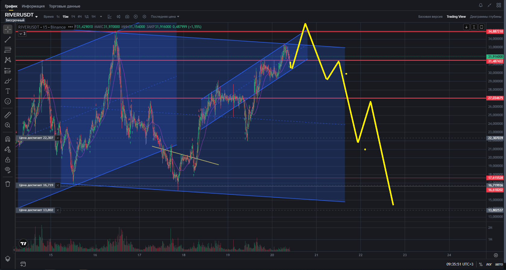 The price will not break the maximum 34.88 and will stay in a flat, squeezing the shorts for some time until it crashes to the lower boundary of the channel, approximately to 15