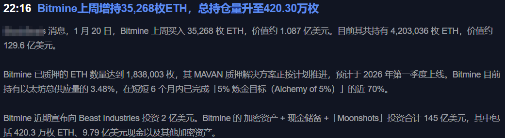 Last week, Bitmine increased its holdings by 35,268 ETH, worth approximately $108.7 million. This is not simply a case of 'buying the dip,' but a systematic accumulation. Its total ETH holdings have reached 4.203 million, accounting for 3.48% of the total Ethereum supply, and it has completed nearly 70% of the '5% alchemy target.' More notably, it has staked 1.838 million ETH and plans to launch the MAVAN staking solution in Q1 2026, indicating that institutions are positioning themselves for the long-term value of the Ethereum staking ecosystem.