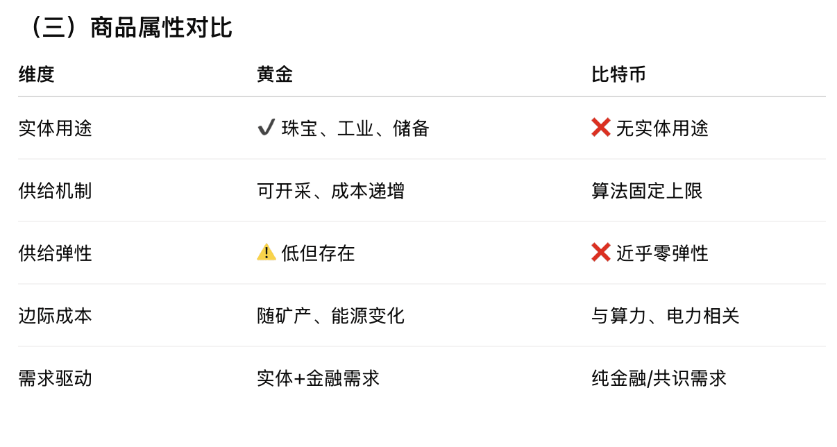 In contrast, Bitcoin is entirely a digital asset with no non-financial use, neither consumable nor producible. Its supply is pre-set by algorithms, and demand comes almost entirely from speculative trading and value consensus. Once consensus weakens, prices lack a buffer mechanism from real demand and cost constraints, significantly amplifying volatility.