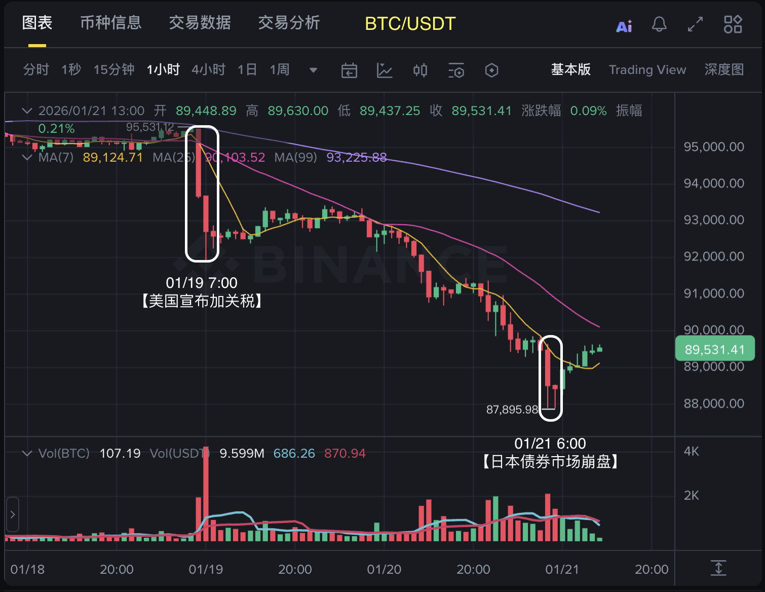 Until January 21, the upward trend in gold had not stopped, refreshing the record high to $4874 per ounce, with a daily increase of 1.5%. In contrast, Bitcoin fell below $88,000, with the daily decline expanding to 5%.