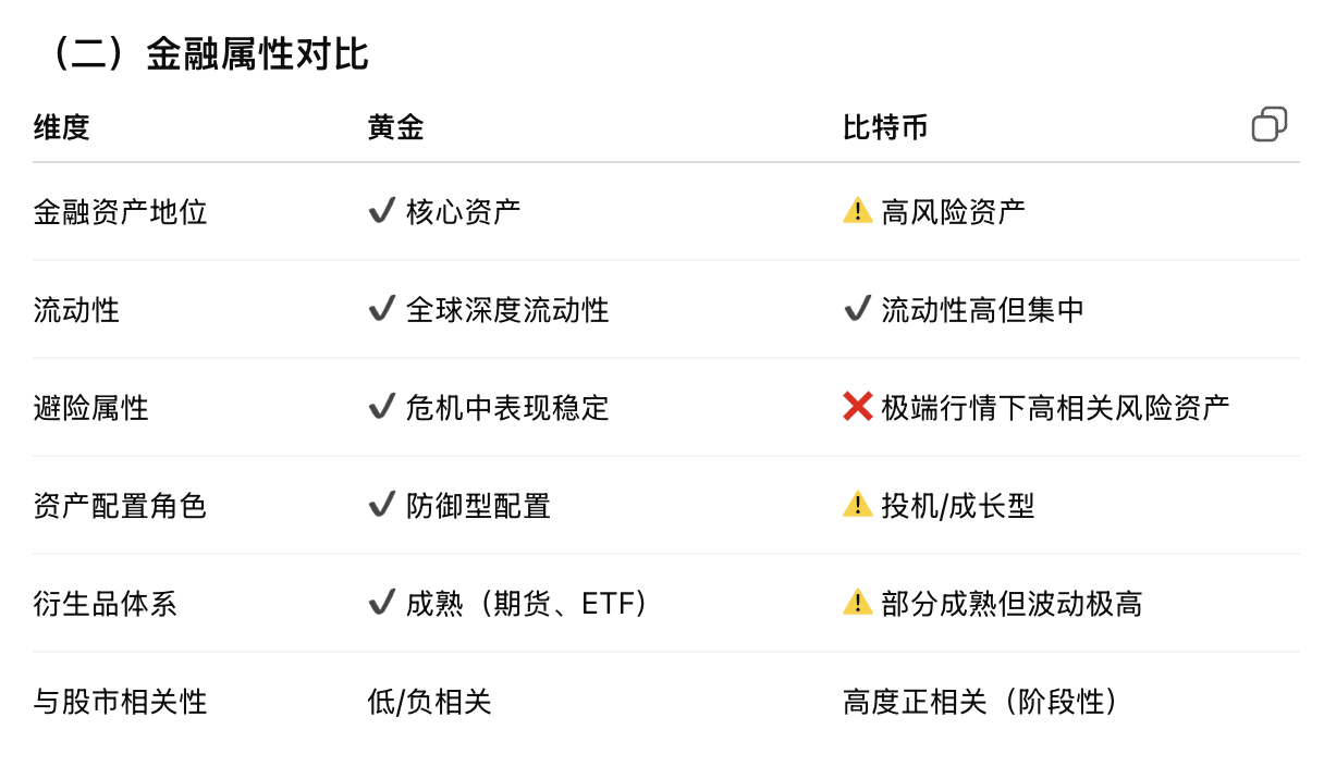 In contrast, while Bitcoin possesses scarcity and the potential for institutional innovation, its pricing still heavily relies on market sentiment and liquidity environment, and in risk shocks, it resembles a high-volatility growth asset more closely.