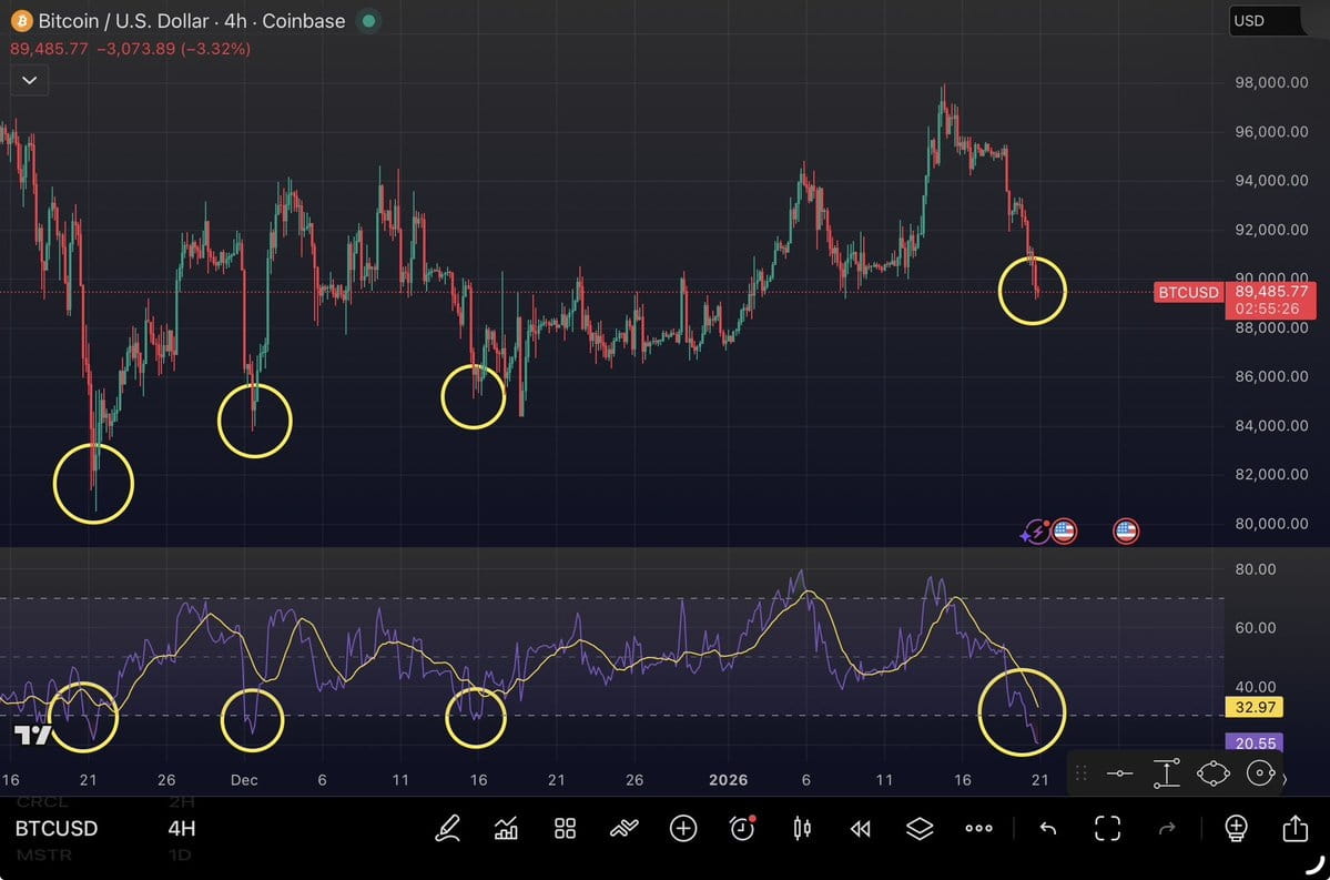 $BTC The RSI of the /Gold ratio has fallen to extreme lows over multiple past cycles.
