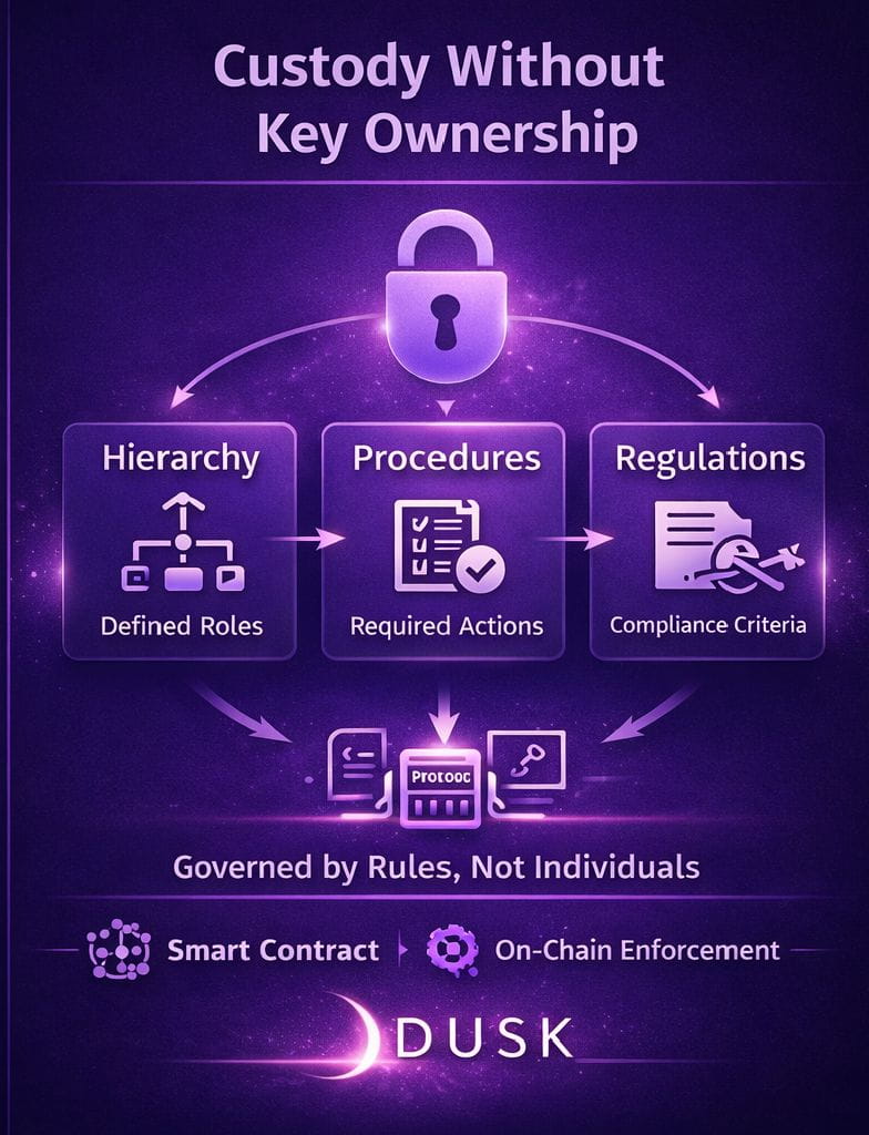 In Dusk, custody is accomplished through governance logic, not through key ownership or control. Rather than being in the hands of individuals (e.g., "Who has the key?"), assets are governed by defined rules (e.g., internal hierarchy, operating procedures, regulations).