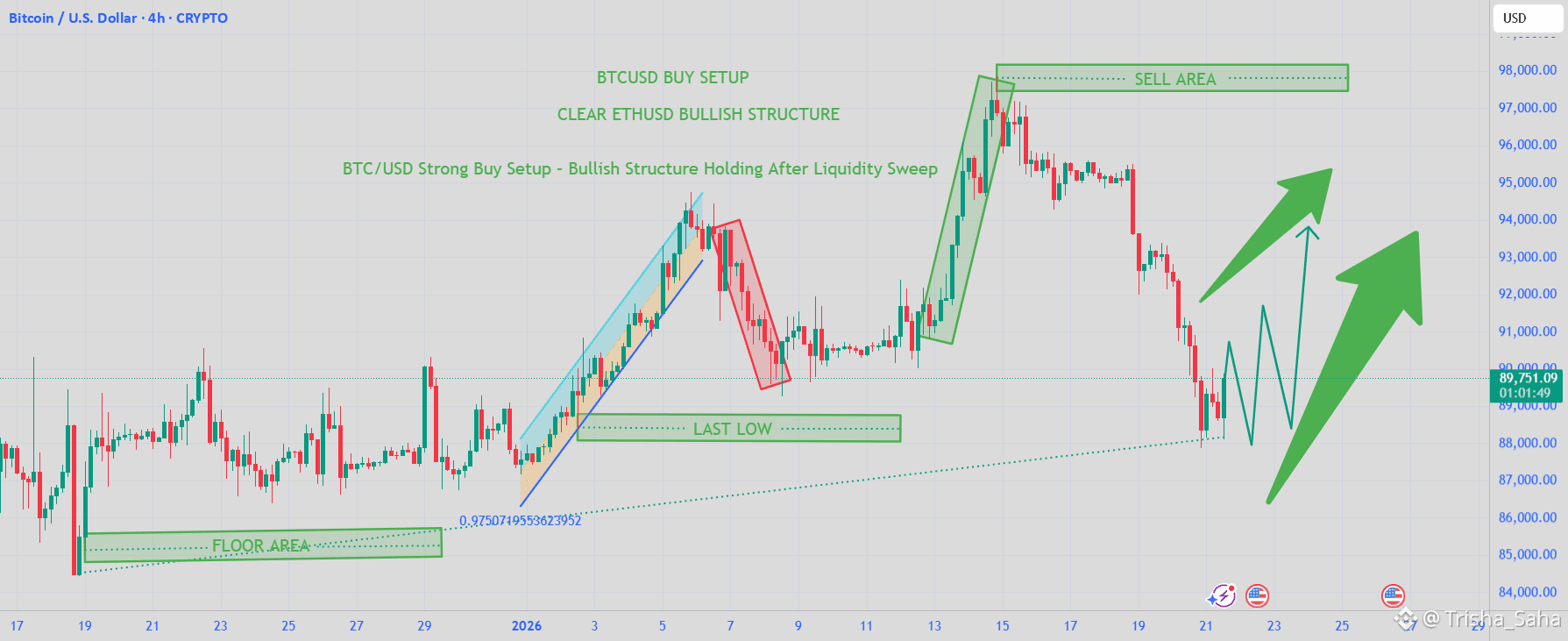 BTC/USD is maintaining a clear bullish market structure on the 4H timeframe despite the recent sharp pullback. Price previously reacted strongly from the floor area, formed higher highs, and respected the last low, confirming overall buyer dominance.