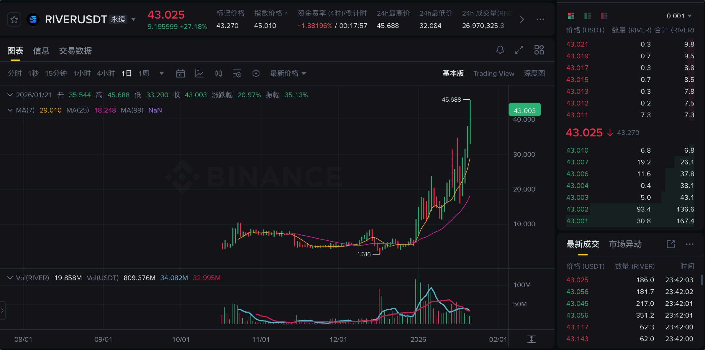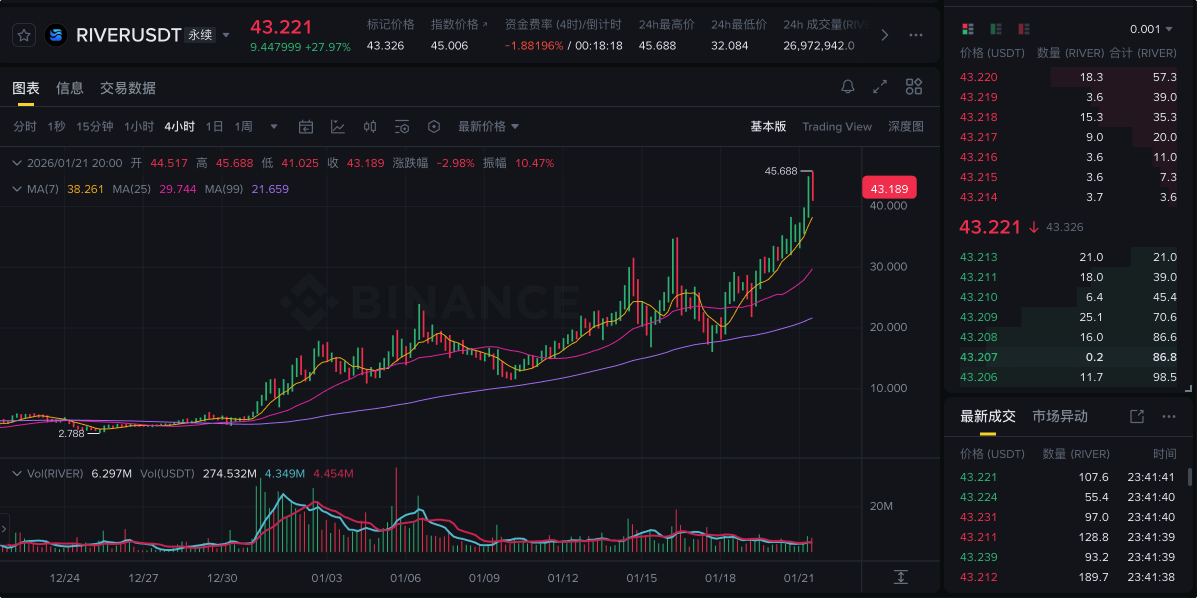 Currently $RIVER (River) is in a very critical "main uptrend acceleration + emotional FOMO" phase. Based on the current K-line volume and price chart and relevant news on social media, here is a detailed analysis of the trend: