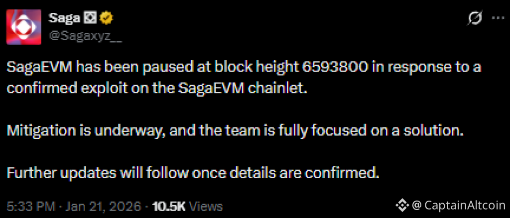 Layer-1 protocol Saga halted its Ethereum-compatible SagaEVM chainlet around block 6.5M following a $7 million exploit. Unauthorized funds were bridged out and swapped into Ether.