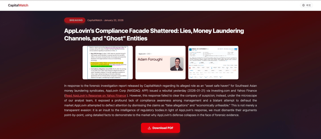 On January 21, 2026, in the face of money laundering allegations from CapitalWatch, AppLovin urgently responded with Yahoo Finance, dismissing the accusations as 'false and economically unfeasible.' However, this pale defense not only failed to clear its suspicions but also exposed its compliance failures and securities fraud in the face of irrefutable evidence. More significantly, CapitalWatch has explicitly warned: three more solid reports are set to be released, and this storm surrounding $APP is just beginning.