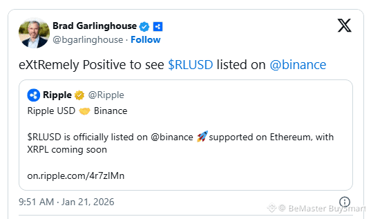 $XRP Ripple CEO Brad Garlinghouse subtly acknowledged XRP while responding to Binance’s official announcement of the listing of Ripple’s stablecoin, RLUSD. The exchange has confirmed that RLUSD trading will begin on January 22, 2025, with withdrawals opening the following day.