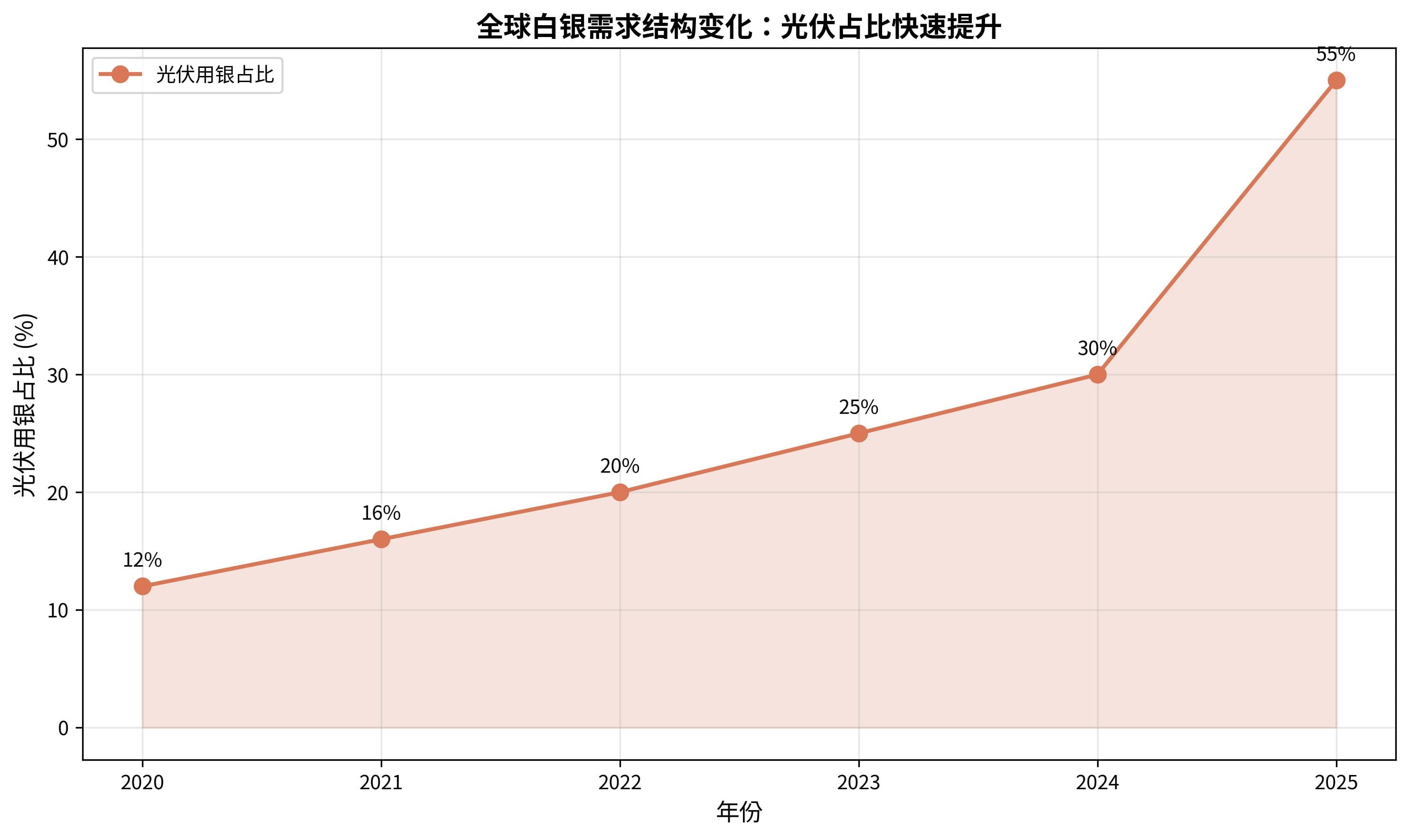 This morning I saw the news that the annual silver demand in the photovoltaic industry has surpassed 5000 tons, but the actual data is even more astonishing—by 2025, the global silver consumption in photovoltaics will reach 7560 tons, doubling compared to three years ago. Photovoltaics have become the largest growth engine for silver demand, with the share soaring from 12% in 2020 to 55% in 2025. This means that approximately 70 tons of silver are needed for every 1 GW of photovoltaic modules produced.