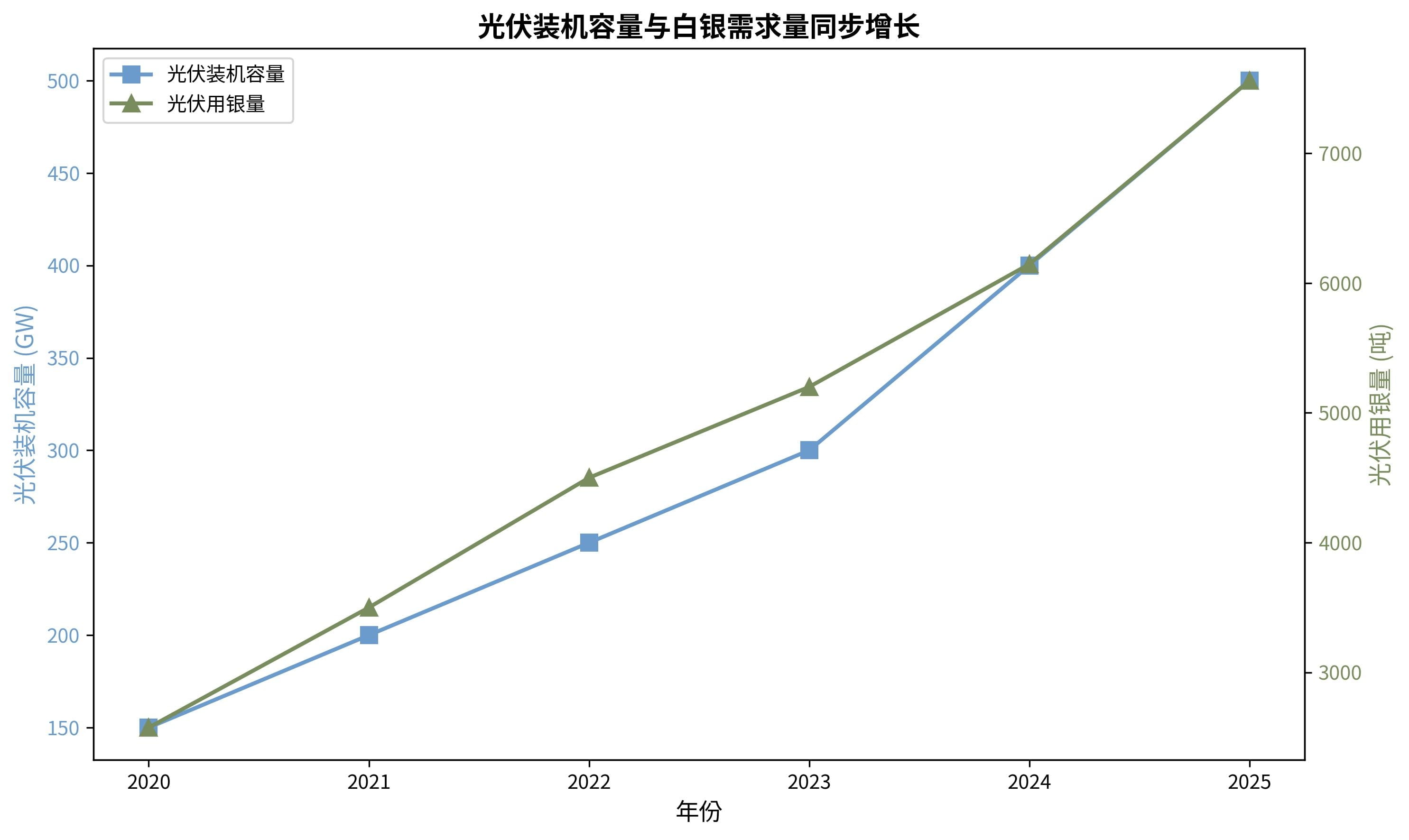 Year Silver Consumption in Photovoltaics (tons) as a Percentage of Total Silver Demand Global Photovoltaic Installed Capacity (GW) 20202,57512%150 20213,50016%200 20224,50020%250 20235,20025%300 20246,14630%400 20257,56055%500
