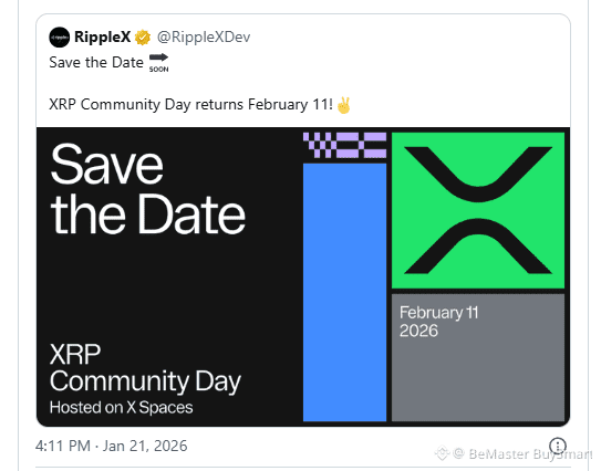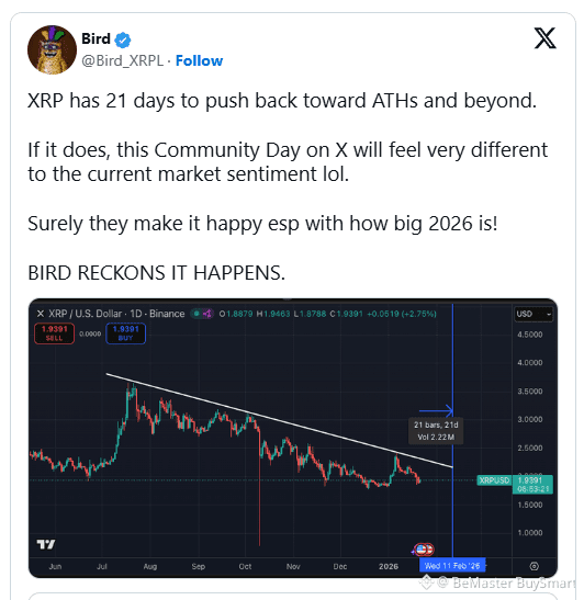 $XRP is entering a critical period for price action, with under 21 days remaining until XRP Community Day on February 11. This is a crucial day to watch, according to a chart shared by crypto analyst Bird (@Bird_XRPL).