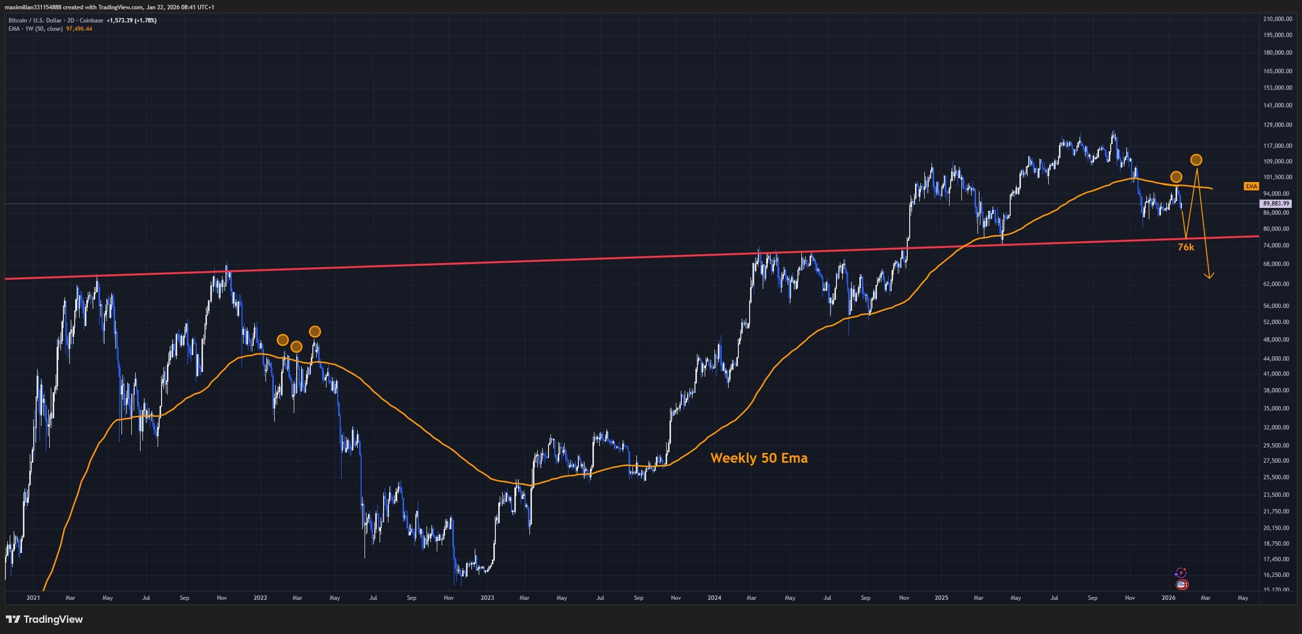 The reality is that BTC has not had a true reclaim of the Weekly 50 EMA – a critically important milestone in every cycle. Instances where the price touches the EMA and is then rejected, as just happened, are often not signs of strength, but rather, they are frequently a psychological trap to draw more people into the market $BTC