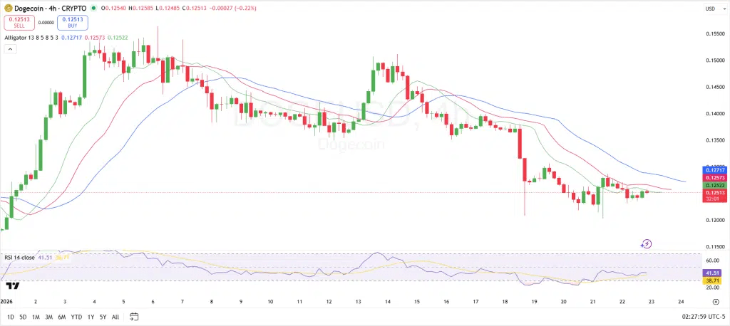 From the chart, Dogecoin is currently consolidating between key support and resistance levels. The 4-hour chart shows that the Alligator indicator remains neutral to bearish, with the green line below the red and blue lines, indicating a lack of clear upward momentum in the market. At the same time, the Relative Strength Index (RSI) is around 41.5, showing that DOGE is neither overbought nor oversold, but slightly leaning towards a downward trend. Traders are focusing on whether the RSI can break above the 50 level; if it does, it will further confirm the possibility of a price increase.