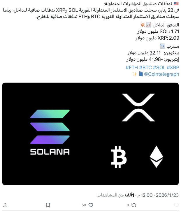 Exchange-traded funds (ETFs) experienced sharp shifts in flows on January 22. While Bitcoin and Ethereum funds recorded significant outflows, XRP and Solana instant funds quietly attracted new money. Data shows that instant XRP funds recorded net inflows of $2.09 million, while instant Solana funds added another $1.71 million.