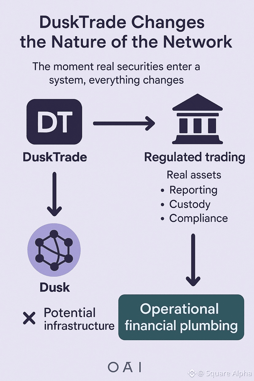If DuskTrade functions as intended, Dusk stops being evaluated as “potential infrastructure” and starts being judged as operational financial plumbing. That’s a higher bar, but it’s also where long-term relevance is earned.