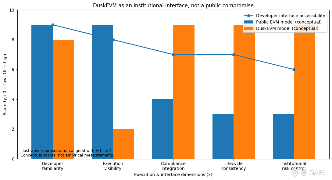 DuskEVM re-defines this issue by separating the interface with the developer with the execution visibility model. As a developer, the environment is known. Known paradigms are used in writing the contracts, tooling is easily available, and the learning curve is also low. However, under that interface, it is executed in the confidential protocol layer of @Dusk . EVM is not operated on transparency-first ledger; it is operated within the framework of a selective disclosure system.