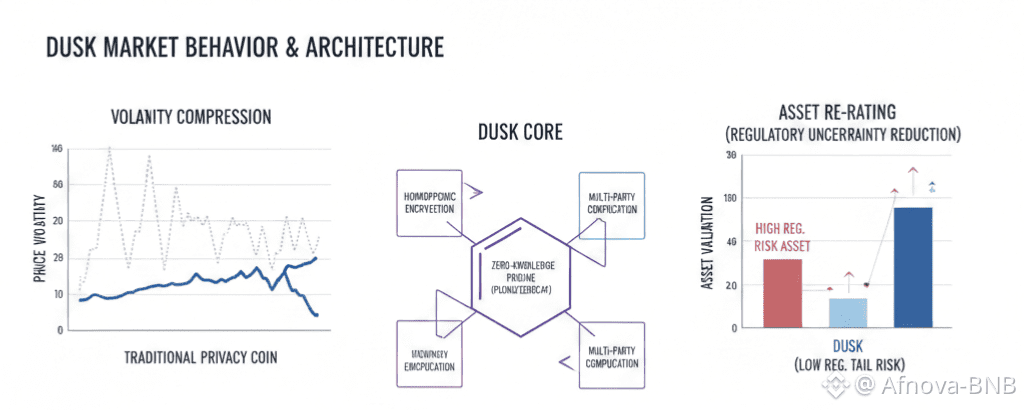The second shift in perspective comes from treating zero-knowledge not as a feature, but as a cost-reduction mechanism. PLONK and ZeroCaf aren’t just technical achievements; they compress the marginal cost of privacy. Older privacy chains sacrifice performance to obscure data. Dusk inverts that trade-off: privacy is the default execution path, optimized in Rust and built around curves that favor efficient proofs. Liquidity cares about that. High-overhead systems amplify volatility—fees spike, confirmations wobble, market makers pull back. By removing those stress points at the base layer, Dusk creates conditions where volatility compression can happen before adoption, not after.