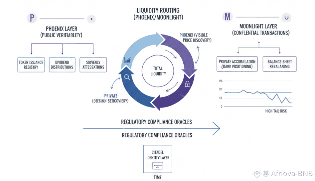 The Phoenix–Moonlight split is where my assumptions really start to break down. Most chains force a binary choice between transparent and private. Dusk allows applications to move between modes within the same flow. That isn’t a UX flourish—it’s control over market structure. Phoenix anchors public verifiability: issuance, dividends, solvency proofs. Moonlight conceals intent: accumulation, secondary trading, balance-sheet rebalancing. When both exist together, liquidity doesn’t disappear—it reroutes. Price discovery stays visible while positioning goes dark. Traders consistently underestimate how constructive that is for sustained volume.