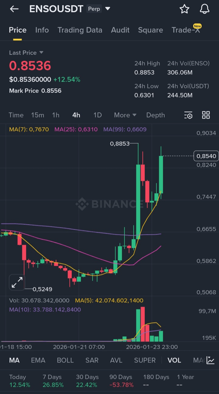 ENSO has risen over 43% in a trading session, increasing from about $0.60 to $0.85. According to Crypto.com, ENSO rose 10.68% in the past 24 hours, indicating continuous growth.