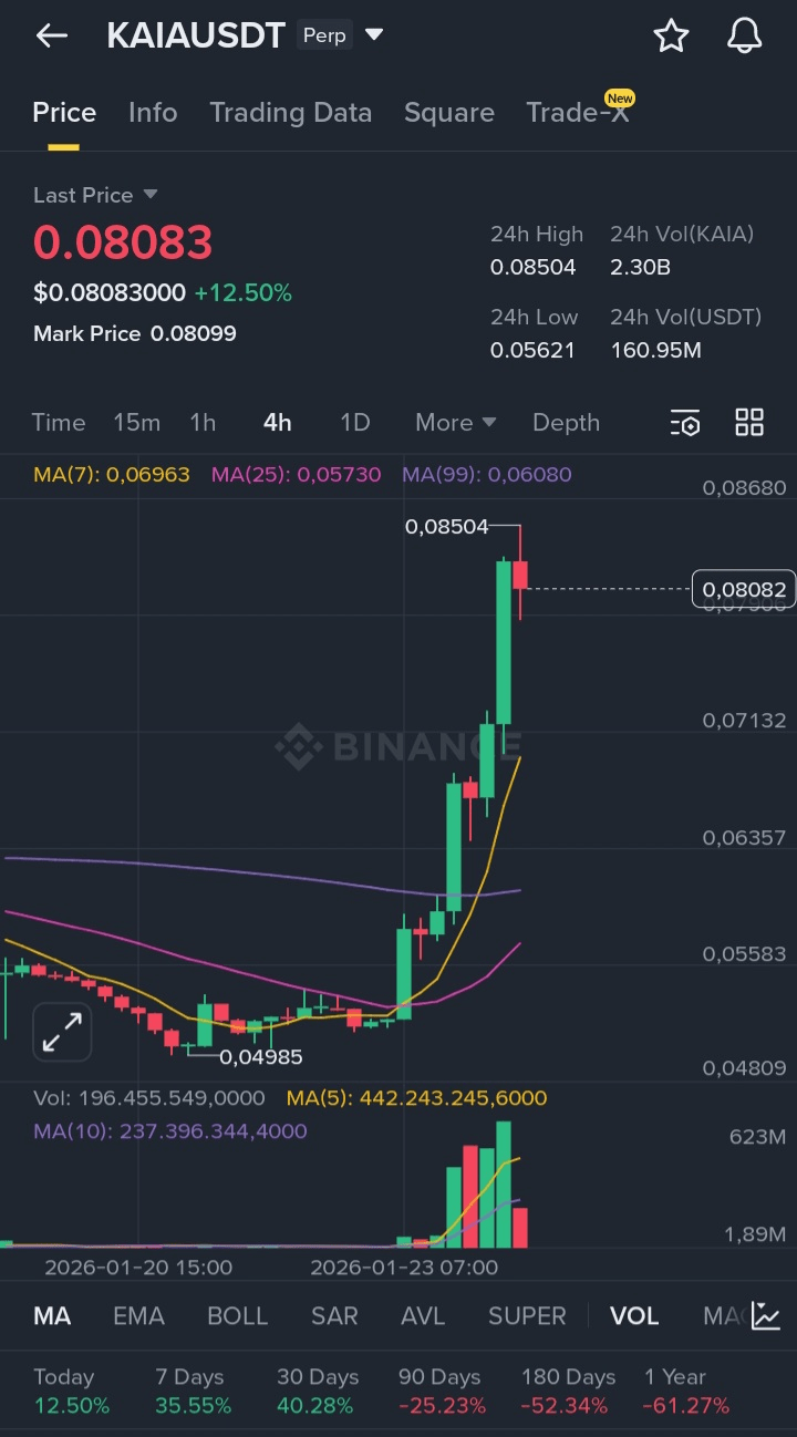 As of today on CoinMarketCap, KAIA is around 0.08 USD, up over 60% from the bottom in just 3 days; in the last 24 hours alone, it increased by ~40%, with trading volume rising over 4 times (483%) compared to the previous day.