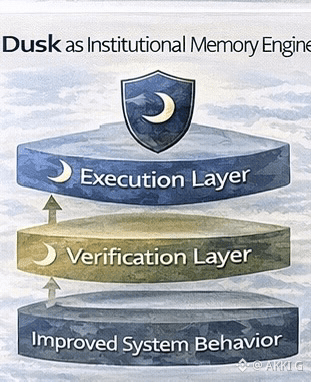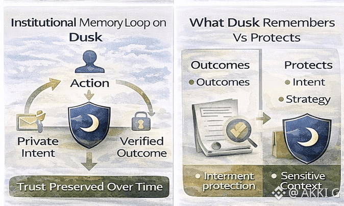Dusk enables institutional memory by separating execution from verification. Actions occur privately. Outcomes are provable and recorded. Over time, the system develops a coherent history that can be used to refine decisions, manage risk, and improve behavior. What it does not do is expose internal strategies or sensitive context.