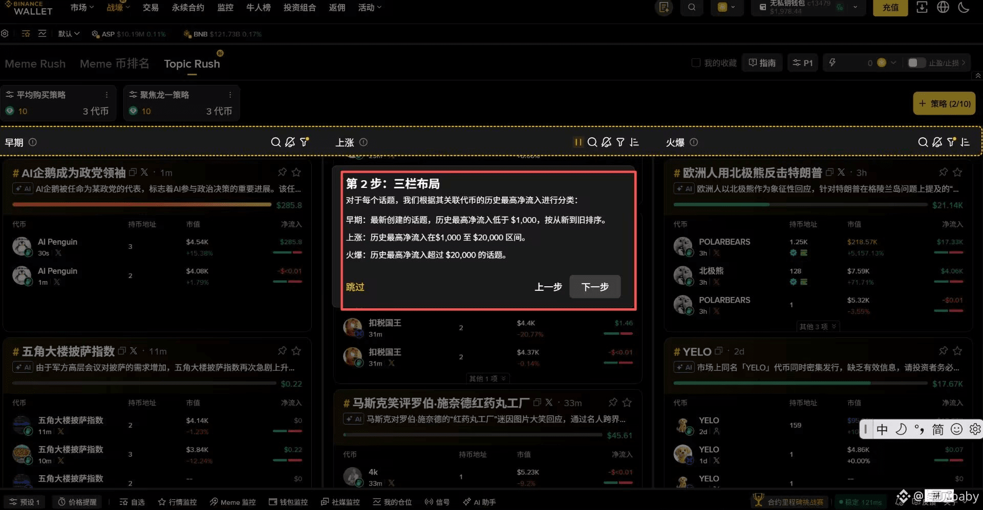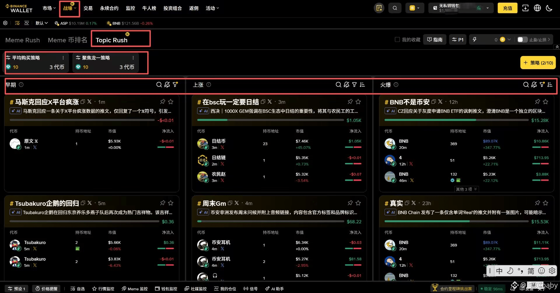 2️⃣中间栏是策略部分,可以设置10个策略,这个目的就是提前设置好冲meme的资金,如果有热门话题出现,并且有meme币后可以第一时间买入,单策略可以将资金分成3分,分别同时买入3个同类型代币(防止分辨不清楚哪个是龙一),看到后直接拖拽到话题卡片就会立刻买入