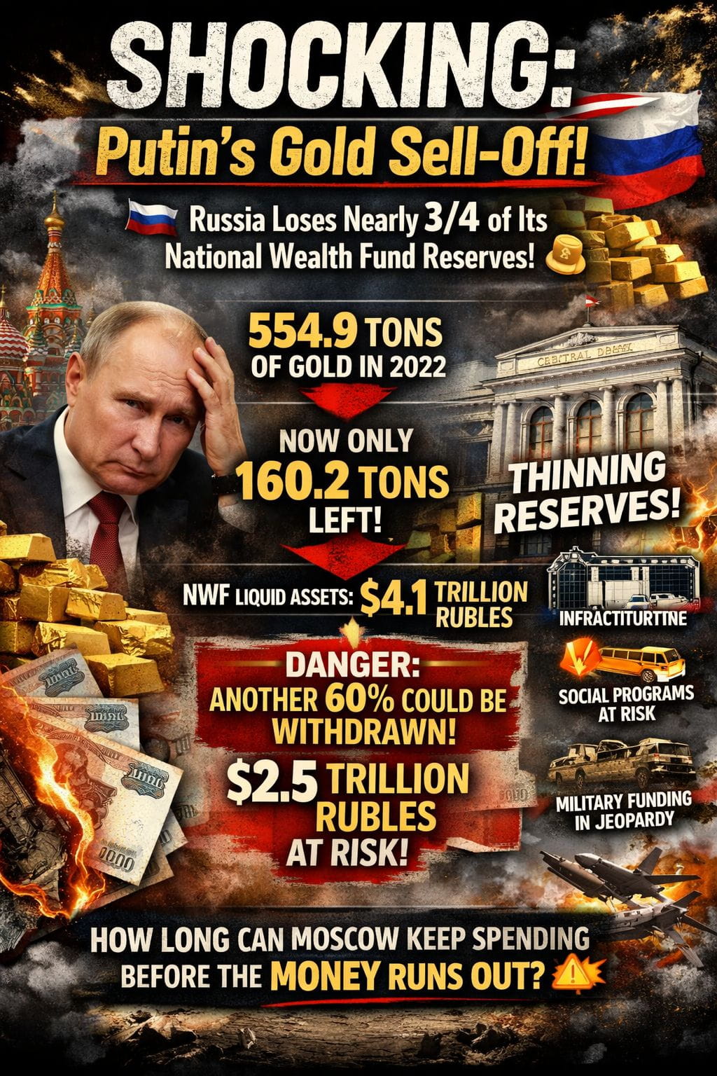 Over the past three years, Vladimir Putin has sold off around 71% of Russia’s gold reserves held in the National Wealth Fund. Back in May 2022, the fund contained 554.9 tons of gold, but as of January 1, 2026, that figure has collapsed to just 160.2 tons — now parked in anonymous accounts at the Central Bank. 😳