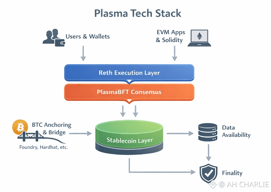 Plasma splits the job into two big pieces. One part runs the EVM logic. The other part decides order and finality. For the EVM side, Plasma uses Reth, which is an Ethereum client built in Rust. Think of Reth like the engine that processes blocks and state. Rust is known for being strict, which can help cut whole classes of bugs. Not magic. Just fewer sharp edges.