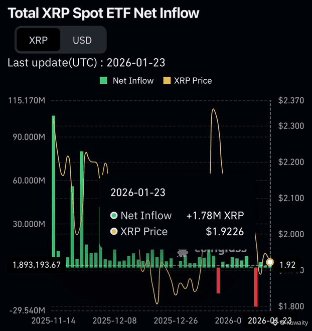 تسير تدفقات $XRP وفق نمط مختلف عن صناديق بيتكوين وإيثريوم. ففي الجلسات الأخيرة، سجلت صناديق BTC وETH تخارجات ملحوظة مع تقليص المتداولين للمخاطر وانتظارهم إشارات أوضح من السوق. وعلى النقيض، سجلت صناديق XRP يومين متتاليين من التدفقات الإيجابية. ففي 22 يناير، أضافت صناديق XRP نحو 2.09 مليون دولار، تلتها إضافة 3.43 مليون دولار في 23 يناير.