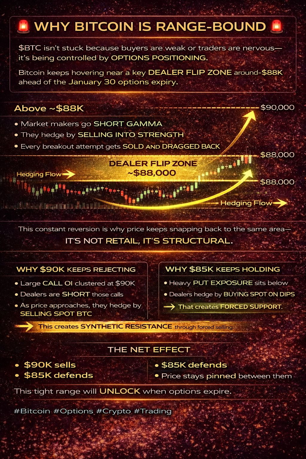 Bitcoin keeps hovering near a key dealer flip zone around $88,000 ahead of the Jan 30 options expiry.