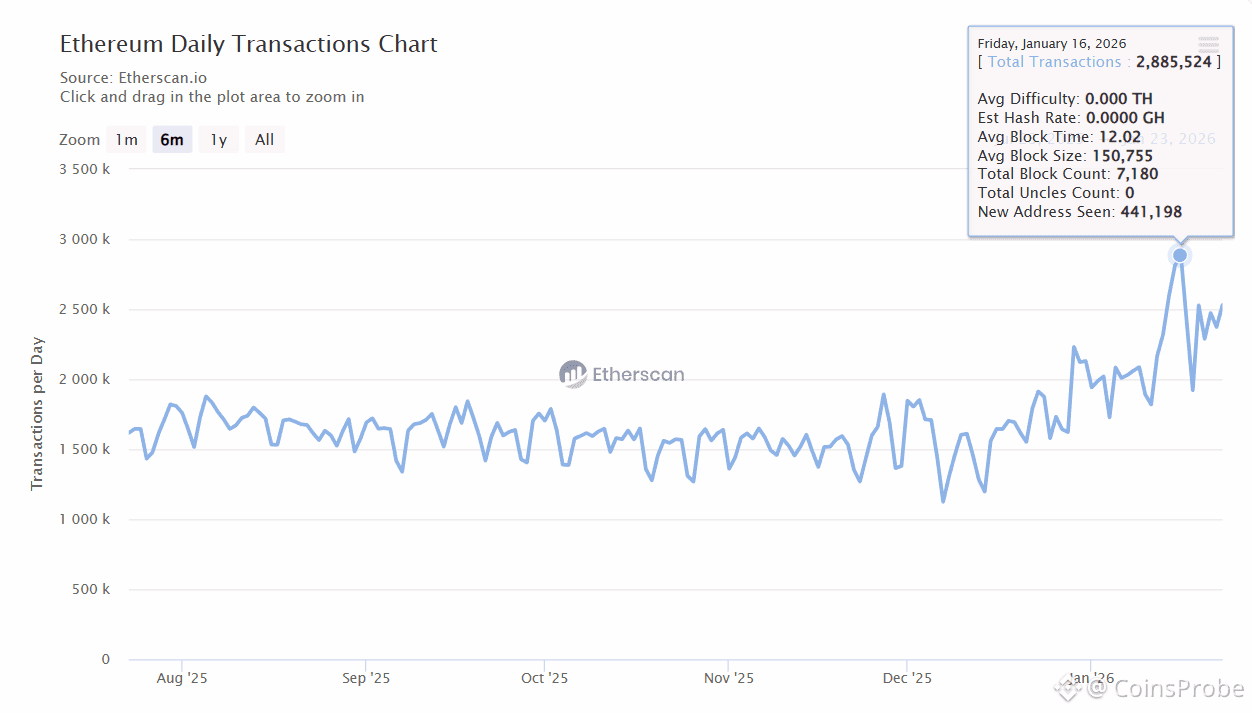The network recently recorded 2.88 million transactions in a single day, marking the highest daily transaction count in Ethereum’s history on January 16. This surge in activity highlights sustained demand for block space, decentralized applications, and settlement — even as price remains range-bound.