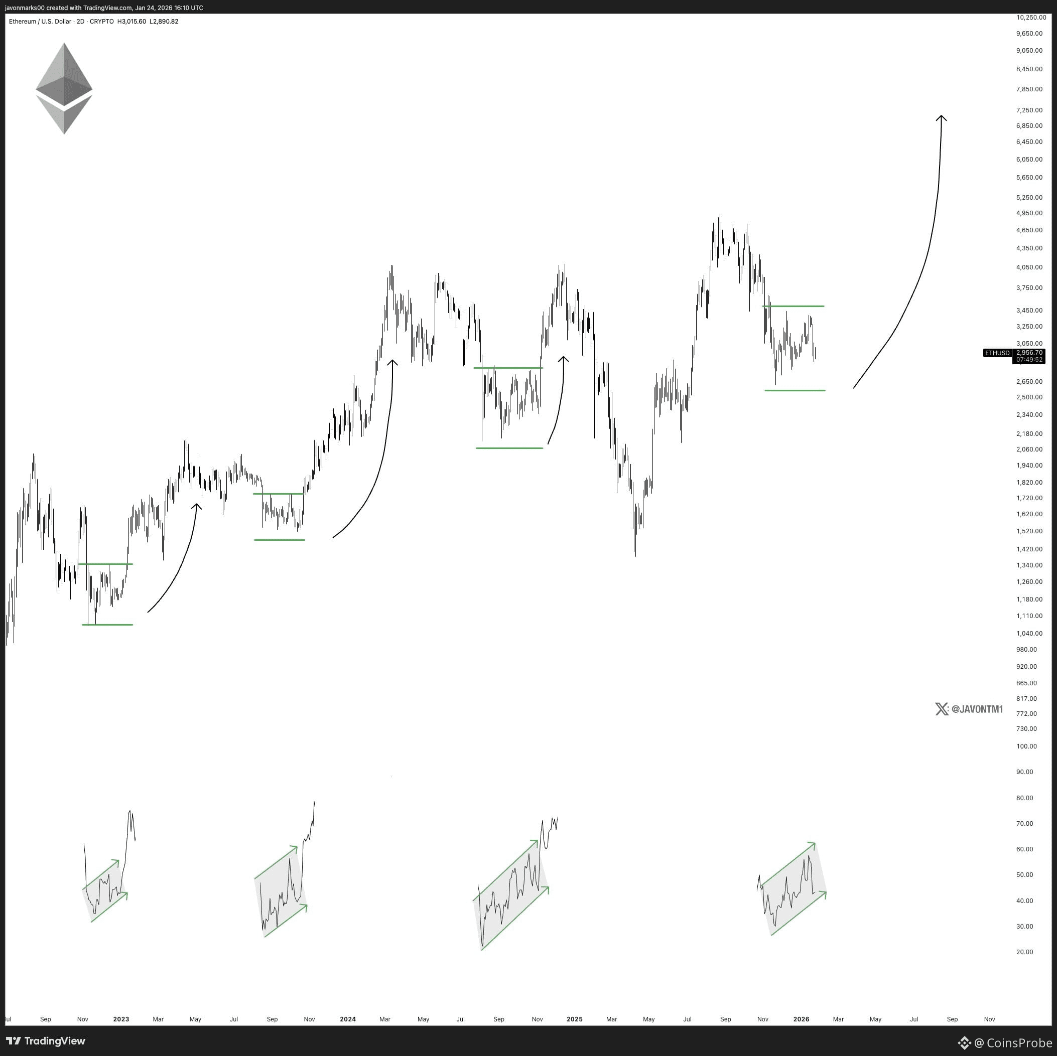 What makes the current setup particularly compelling is the RSI behavior. In previous cycles shown on the chart, Ethereum’s RSI cooled off from overbought levels during consolidation phases before re-expanding upward just ahead of major price advances.