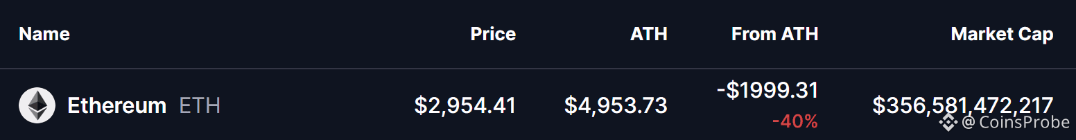 Ethereum (ETH) is currently trading near $2,950, sitting roughly 40% below its all-time high around $4,950. While that gap may appear bearish at first glance, historical market cycles suggest that this type of distance from ATH often occurs during mid-cycle consolidation phases, not at major market tops.