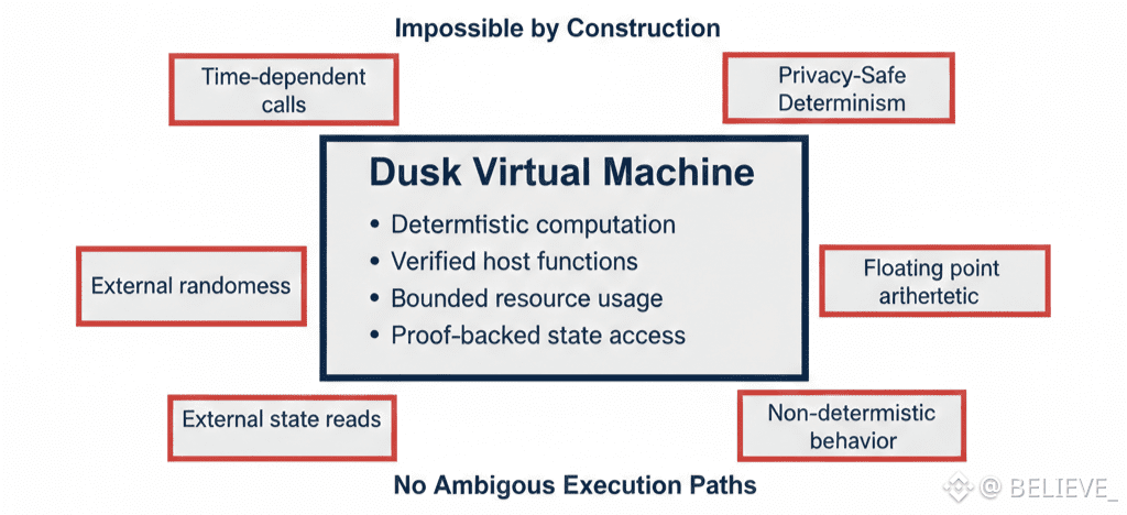 The DUSK token benefits indirectly from this structure. Economic actions—fee accounting, execution limits, settlement—depend on correct execution. When the VM enforces strict boundaries, economic behavior becomes predictable. Participants can model costs and outcomes without worrying about hidden execution paths.
