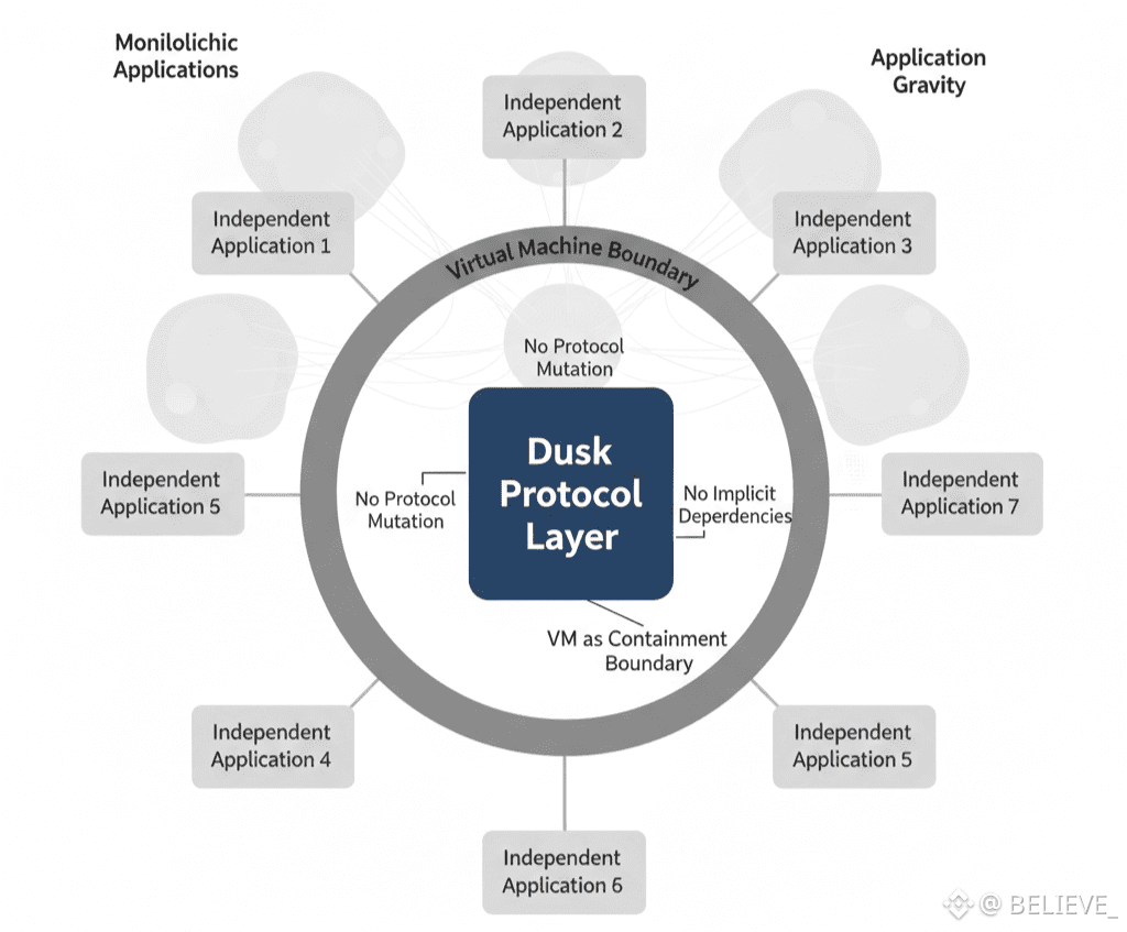 This has ecosystem implications. In some blockchains, a handful of popular applications become de facto infrastructure. Their bugs, upgrades, or failures ripple outward. Dusk’s VM resists that pattern. Applications remain consumers of the protocol, not co-authors of it.