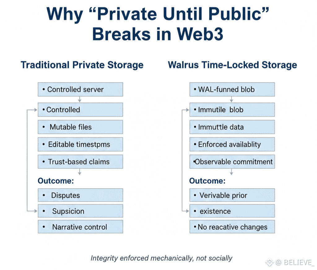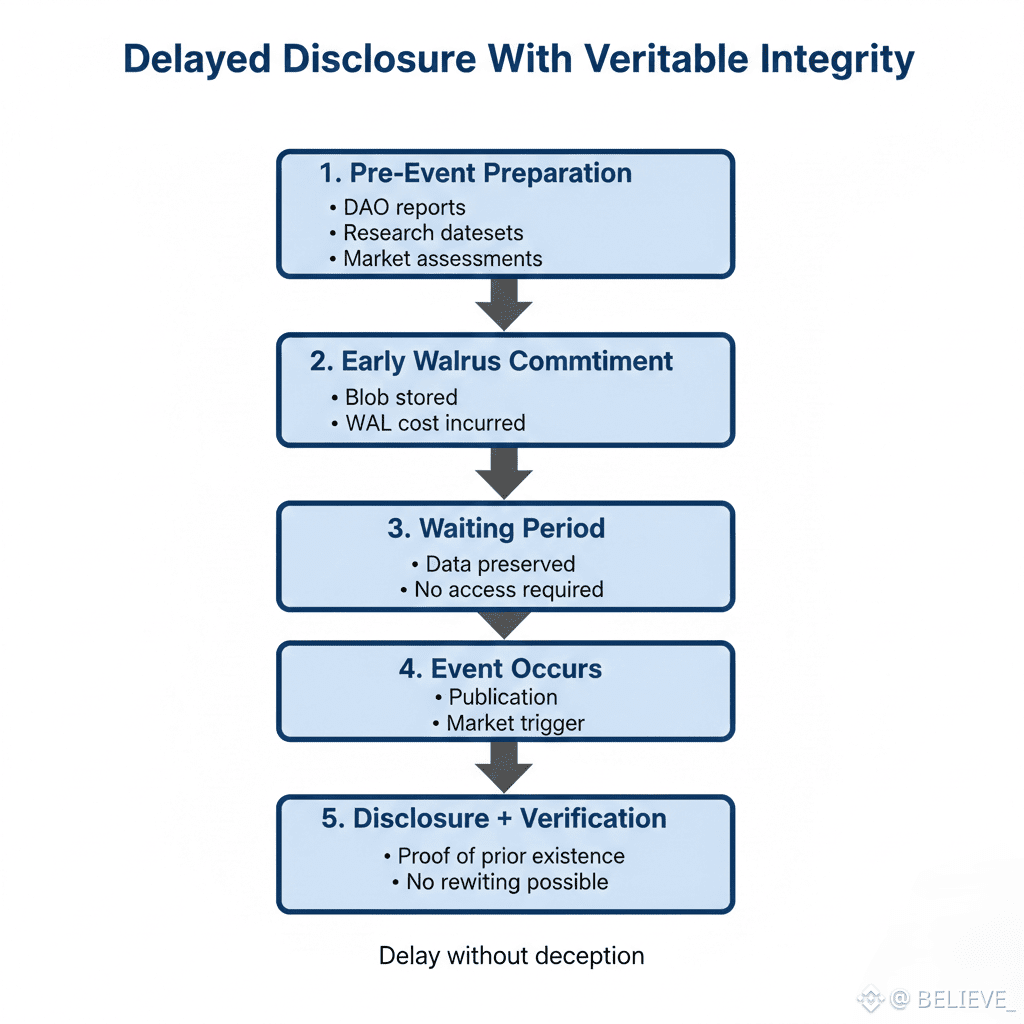 Walrus introduces a different approach: time-locked transparency, where data can be committed early, preserved honestly, and revealed later without relying on secrecy or custodians.