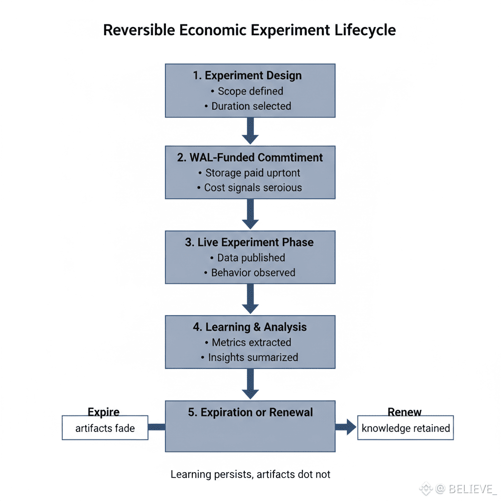 Experiments conducted on Walrus use the same mechanics as production: real availability guarantees, real funding decisions, real expiration. The difference isn’t realism—it’s intent. Everyone involved knows the data is provisional.