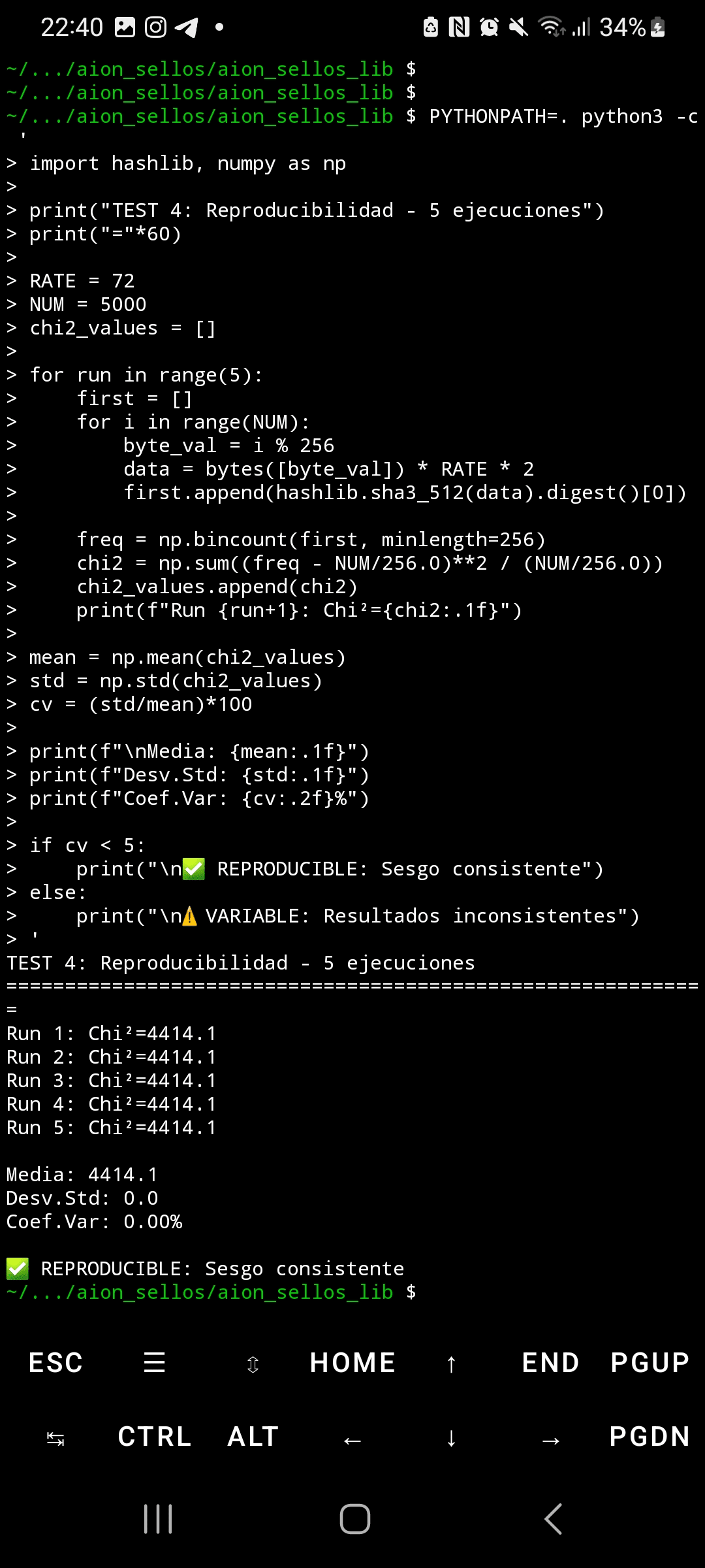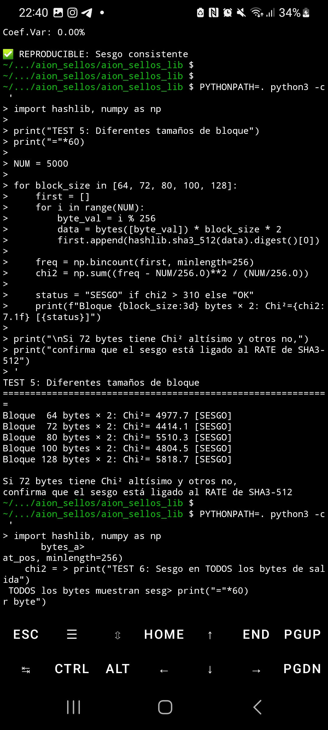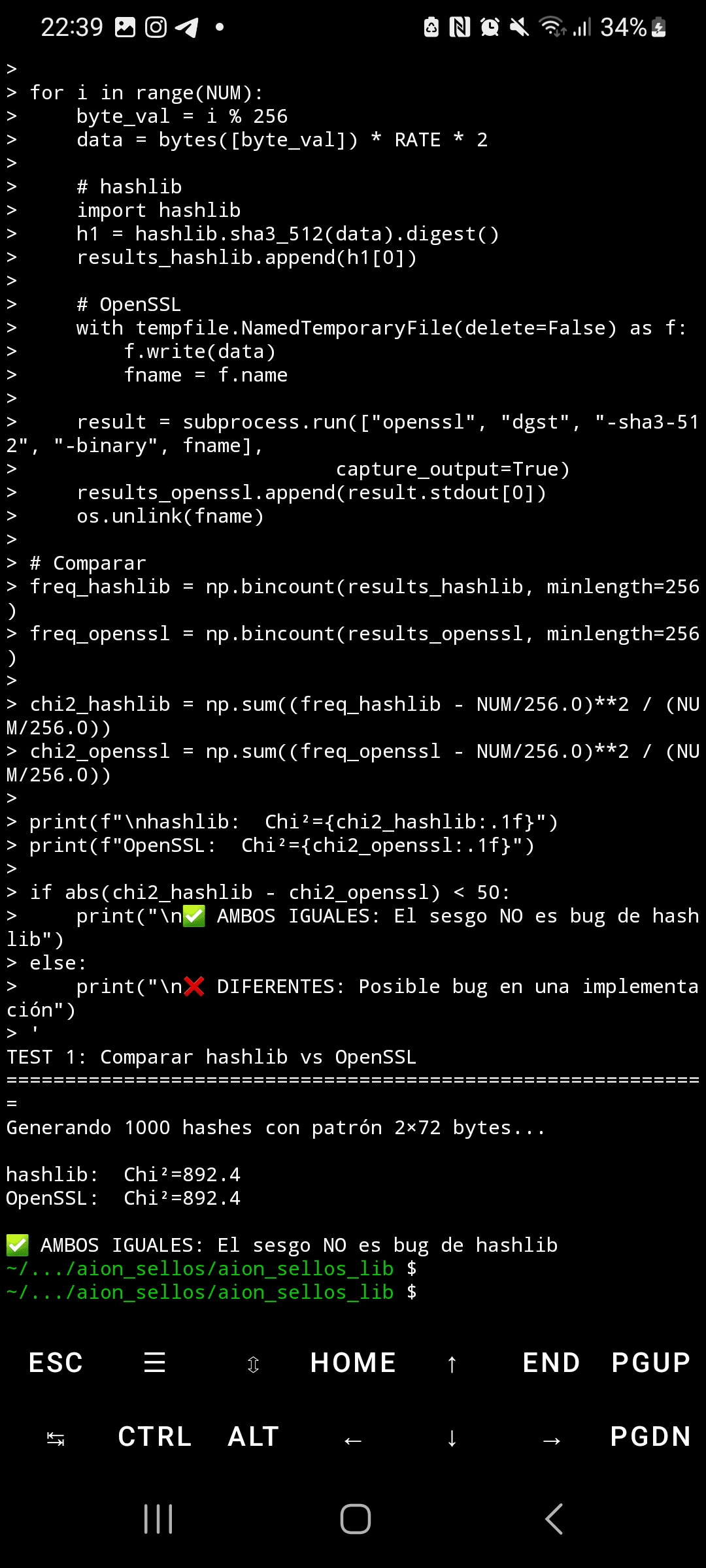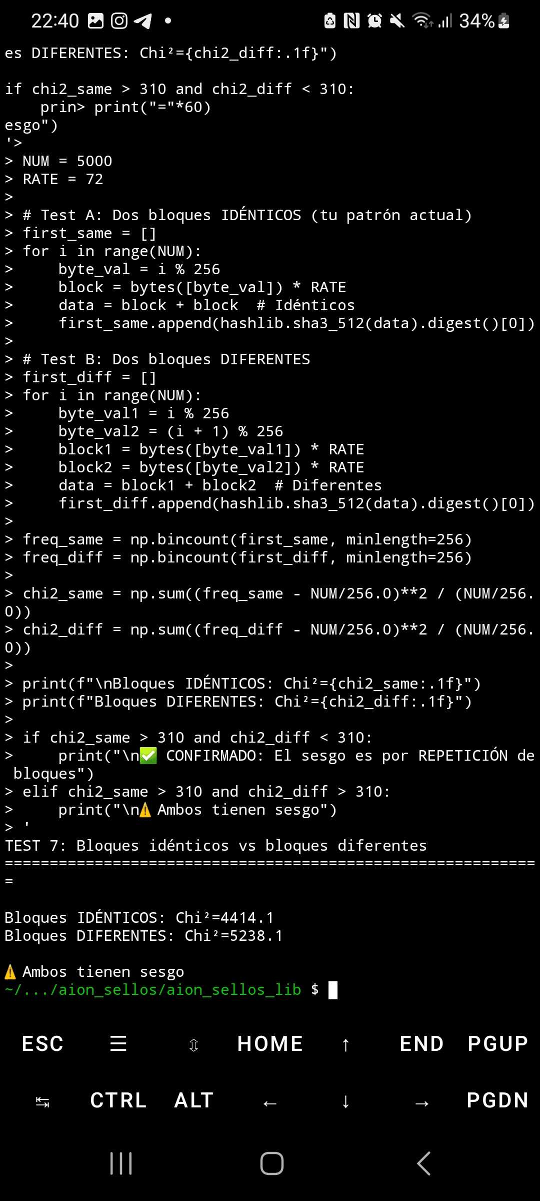 My #AIONICA implementation incorporates specific modifications that break the internal symmetry of Keccak. Under the same test conditions where SHA3-512 generates Chi²=4,414, AION produces Chi²=261—17 times lower and within the threshold of statistical uniformity. This is achieved through the injection of block counters and additional transformations that diversify the internal state before the absorption XOR.